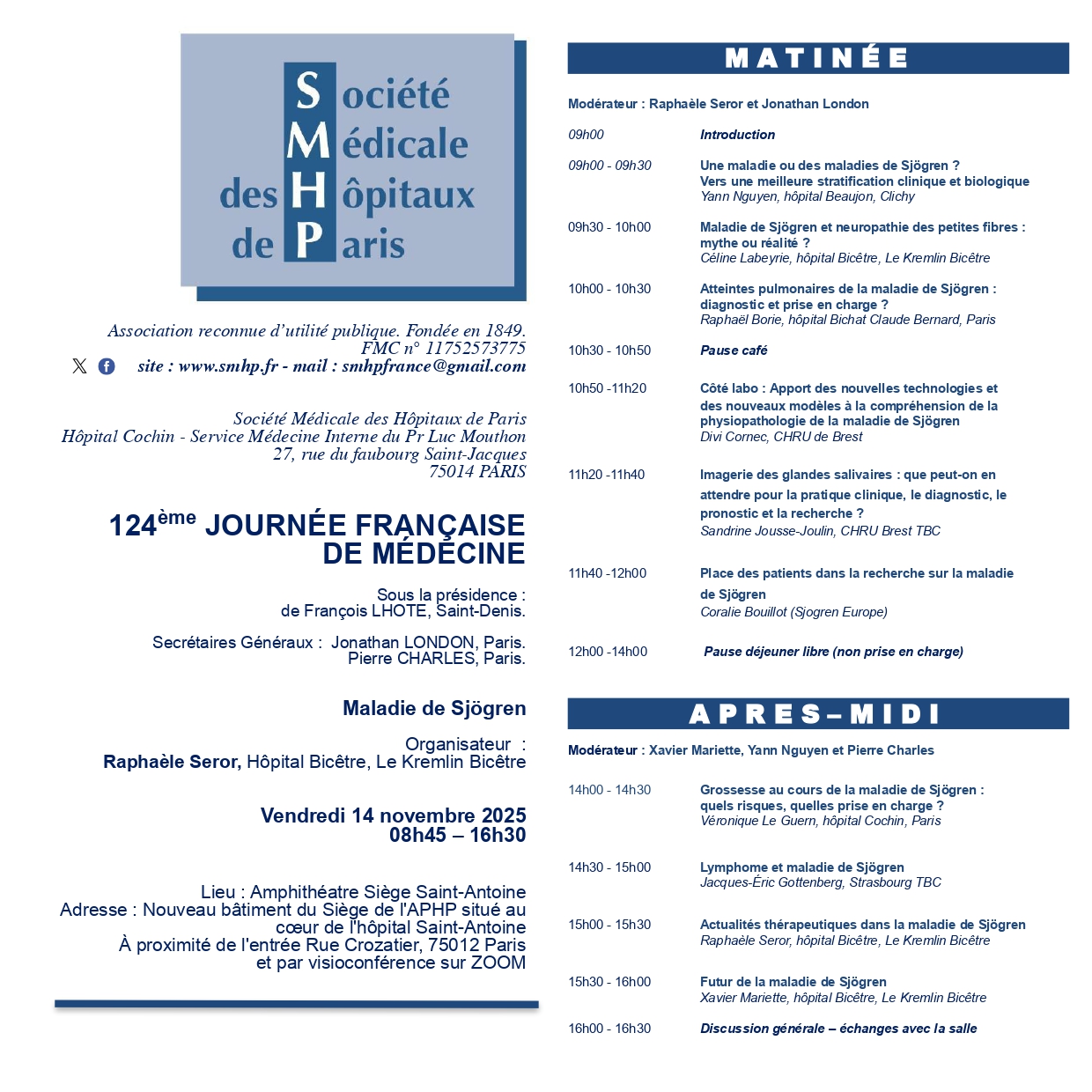 15h00 – 15h30 Raphaèle Seror (Hôpital Bicêtre) : Actualités thérapeutiques dans la maladie de Sjögren.